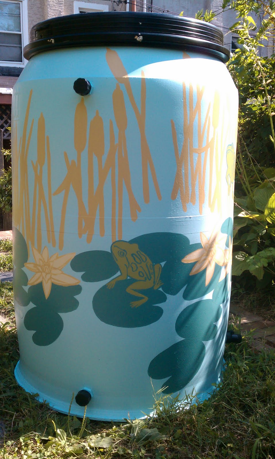 I was inspired by the canal which runs through Manayunk to make frogs leap and lily pads float across my barrel and the beautiful weather we had provided the perfect excuse to paint outside. Here are two pics which I took quickly before I delivered the barrel. The best part is that after the festival I get to keep the barrel and install it to collect rainwater for my garden! Unless someone wants to buy it - then I'll totally sell it...and make another for me.